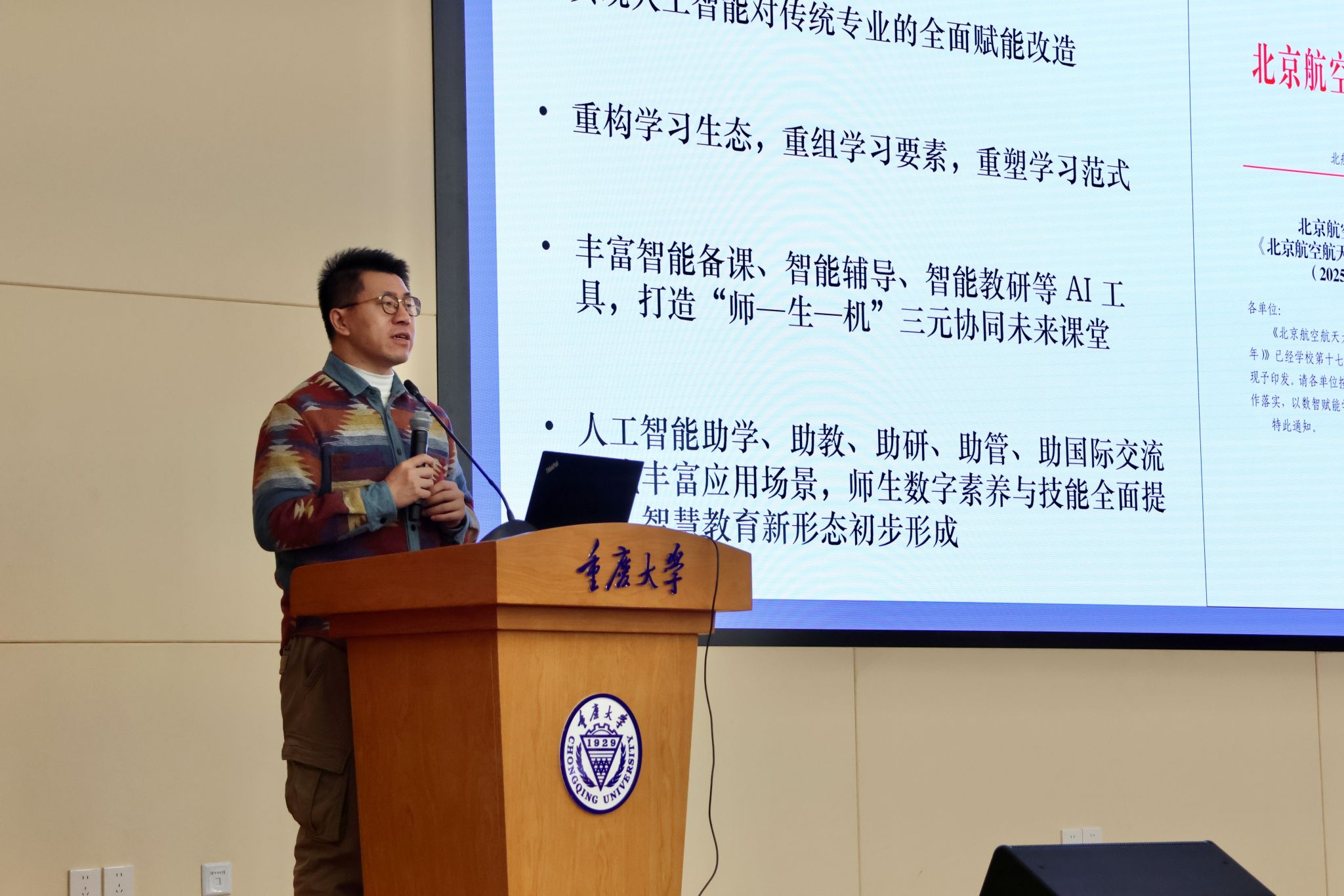 副院长王怡副教授以“AI 赋能重邮外语教育教学:理念、实践与新生态构建” 为主题,强调 AI 赋能的必要性与优势,,构想 “课程 — 教学 — 资源 — 评价 — 教师发展” 五位一体外语教育新生态,强调 AI 是支持教师、成就学生的工具,而非替代者。