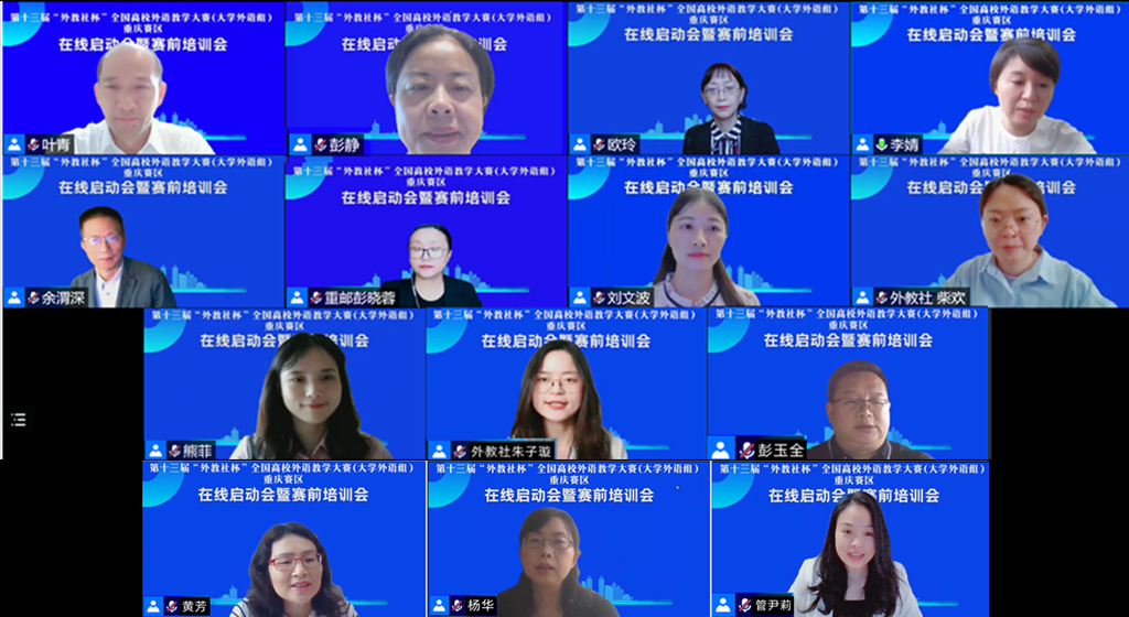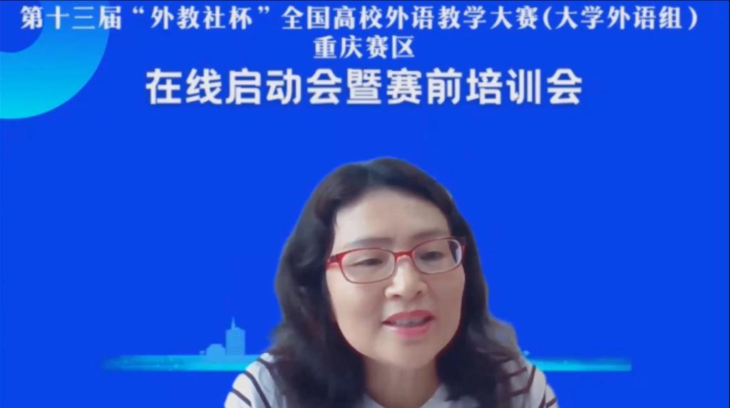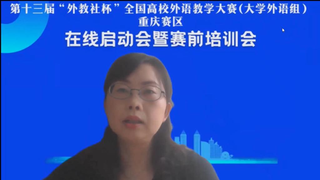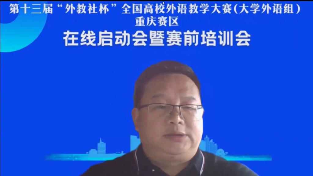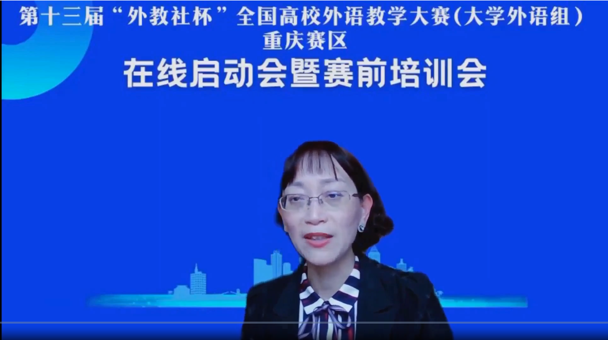 2022年5月28日,第十三届“外教社杯”全国高校外语教学大赛(大学外语组)重庆赛区在线启动会暨赛前培训会成功举办。本届教学大赛由重庆市教育委员会主办,重庆市普通本科高等学校公共基础课程教学指导委员会、重庆邮电大学、上海外语教育出版承办,重庆市高等教育学会大学外语教学研究专业委员会、重庆市外文学会协办。本次会议通过腾讯会议形式在线举办,面向重庆市各高校全体大学外语老师,通过专家讲座以及往届获奖选手经验分享等环节,帮助参赛教师做好赛前准备工作,解读大赛章程,深入理解比赛文件和比赛流程,实现以赛促教、赛教融合的主旨。