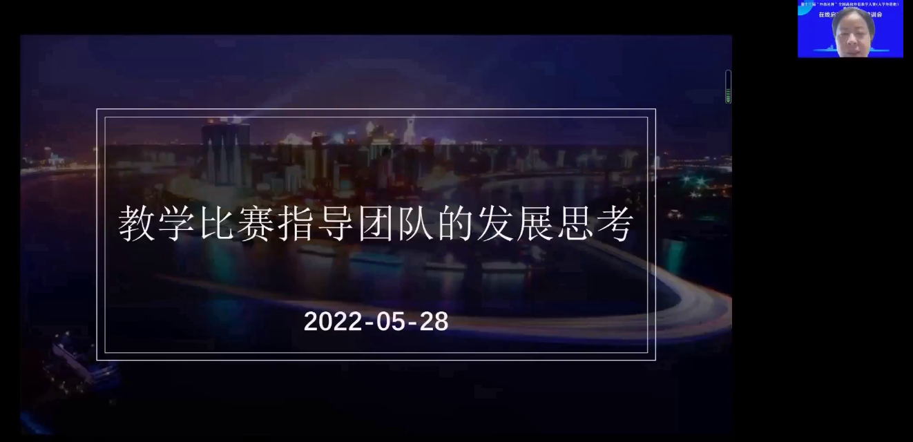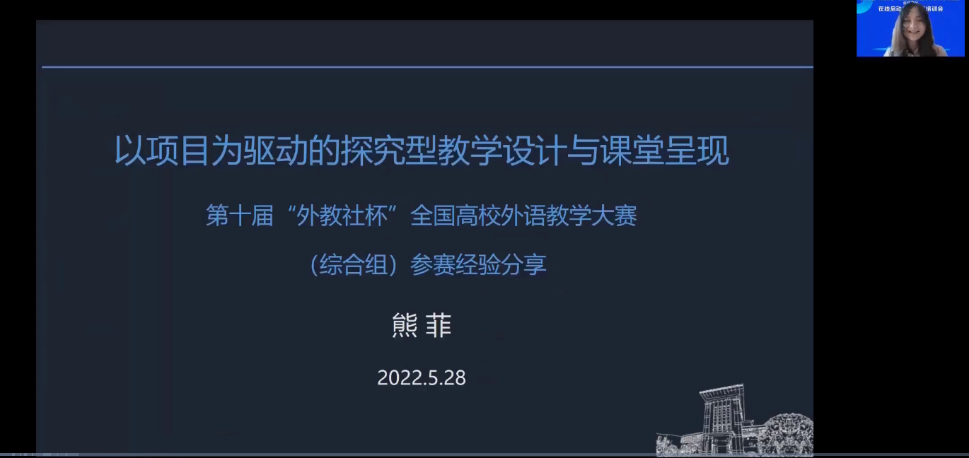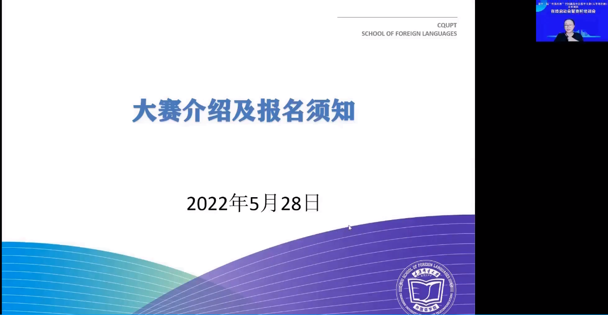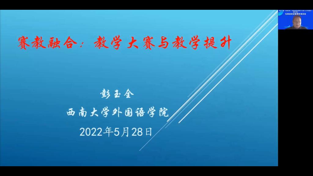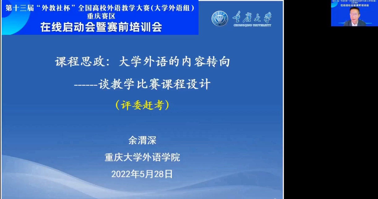 2022年5月28日,第十三届“外教社杯”全国高校外语教学大赛(大学外语组)重庆赛区在线启动会暨赛前培训会成功举办。本届教学大赛由重庆市教育委员会主办,重庆市普通本科高等学校公共基础课程教学指导委员会、重庆邮电大学、上海外语教育出版承办,重庆市高等教育学会大学外语教学研究专业委员会、重庆市外文学会协办。本次会议通过腾讯会议形式在线举办,面向重庆市各高校全体大学外语老师,通过专家讲座以及往届获奖选手经验分享等环节,帮助参赛教师做好赛前准备工作,解读大赛章程,深入理解比赛文件和比赛流程,实现以赛促教、赛教融合的主旨。