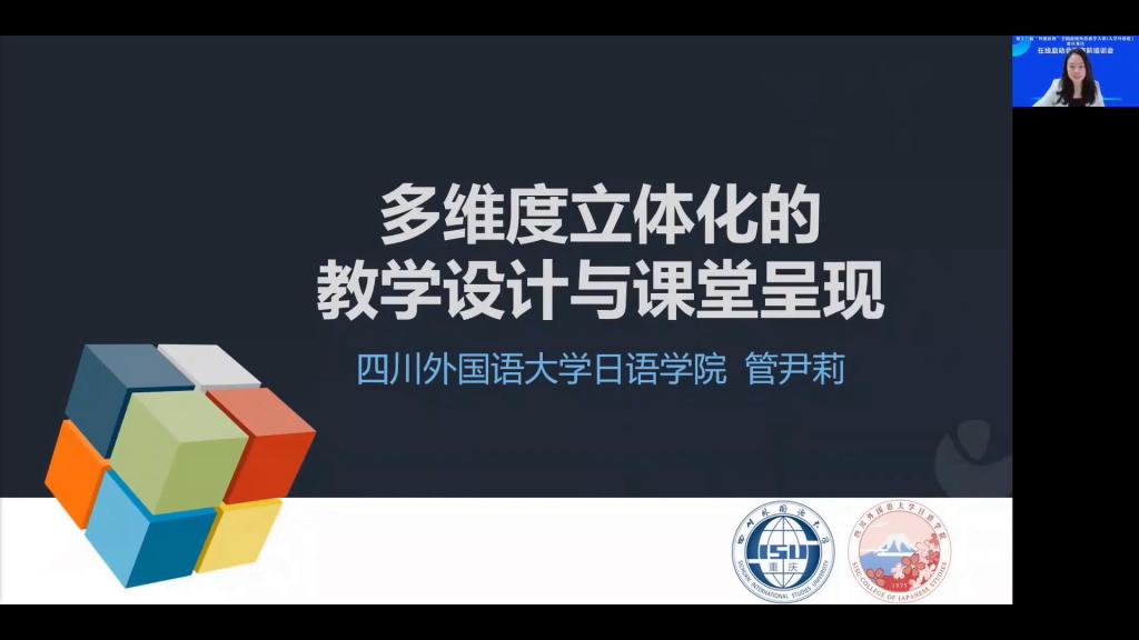 进入最后一个环节,第十二届重庆日语专业组特等奖获奖选手四川外国语大学管尹莉老师带来题为《多维度立体化的教学设计与课堂呈现》的经验分享。管老师首先介绍了复赛阶段课程综述环节的基本思路,并指出,教学目标设计要具体化、能落实、可评价,参赛教师需科学合理地安排单元时间和课时时间,明晰课程模式。管老师以多维度立体化的课堂设计为例,展示如何有效打造线上线下混合式课堂。管老师的经验分享思路清晰,创新性强,值得各位参赛教师学习、借鉴。