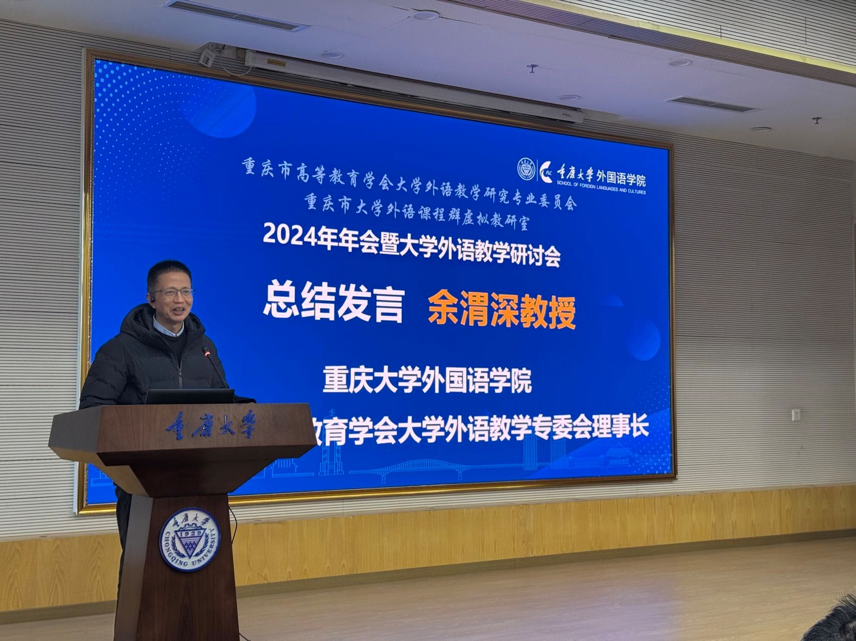 最后,重庆市高等教育学会大学外语教学专委会理事长余渭深教授对本次年会进行总结发言。余教授的发言以“形势、任务、挑战”为核心,总结了大学外语教育的新形势,包括英语作为国际通用语言的重要性提升、世界格局变化与中国崛起对外语教育的影响,以及重塑人类命运共同体意识的重要性。他提出了立德树人、提升全球胜任力、教学内部转向和教学方法创新等新任务,并指出了高校外语教师面临的新挑战,如从语言工具教育到语言育人的转变、文明互鉴的中国故事的传播、多素养的培养以及技术依赖与融合的处理,强调了超越并驾驭AI技术在外语教育中的重要性。